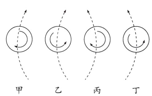 D 解析:由甲、丙图可知,足球沿顺时针方向旋转,足球右侧空气流速大,压强小,左侧空气流速小,压强大,足球在压强差的作用下逐渐向右侧偏移,故甲图正确,丙图错误;由乙、丁图可知,足球沿逆时针方向旋转,足球左侧空气流速大,压强小,右侧空气流速小,压强大,足球在压强差的作用下应该逐渐向左侧偏移,故乙图错误,丁图正确. 故选D.