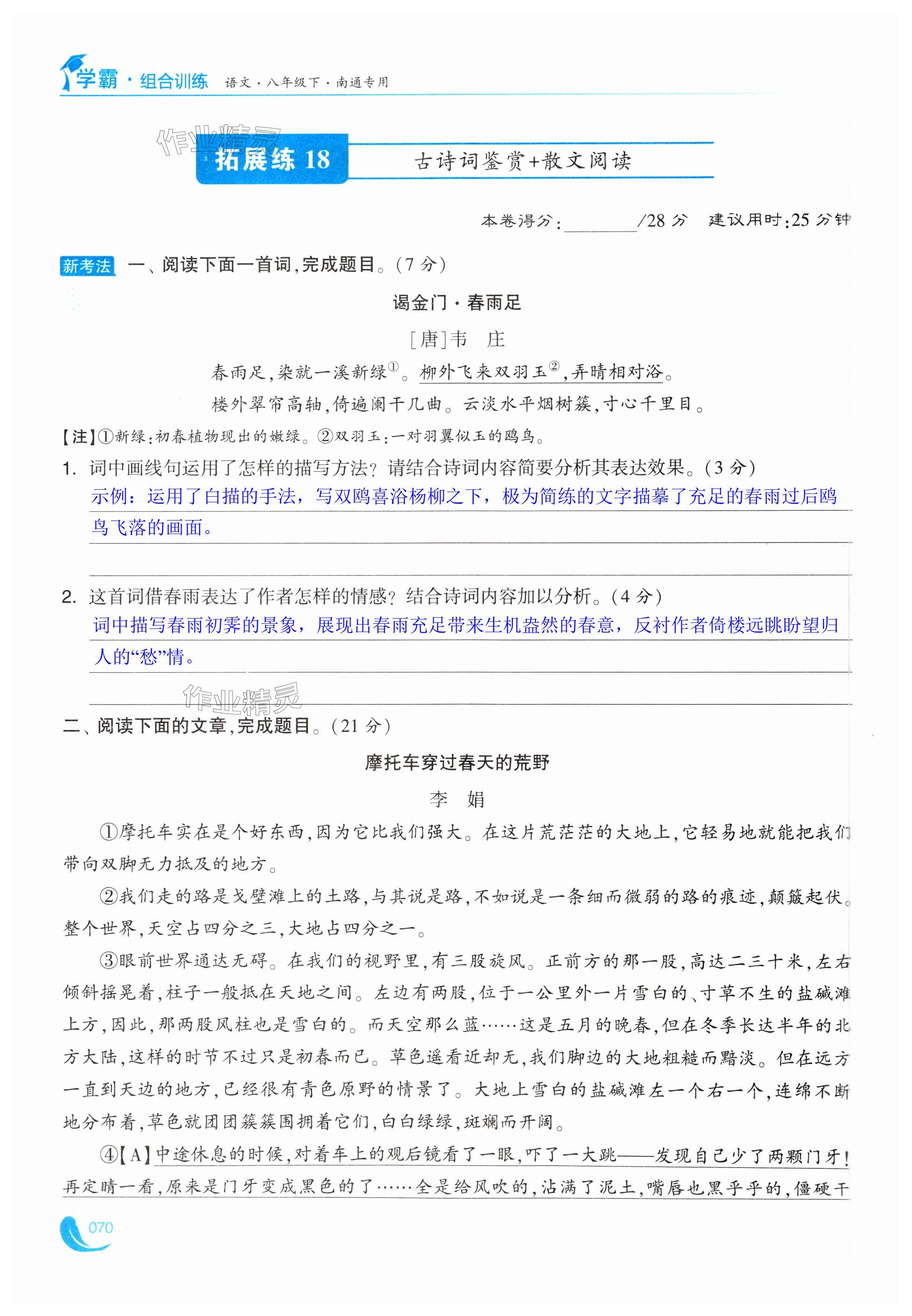 注:目前有些书本章节名称可能整理的还不是很完善,但都是按照顺序排列的,请同学们按照顺序仔细查找。练习册 2025年学霸组合训练八年级语文下册人教版南通专版 答案主要是用来给同学们做完题方便对答案用的,请勿直接抄袭。