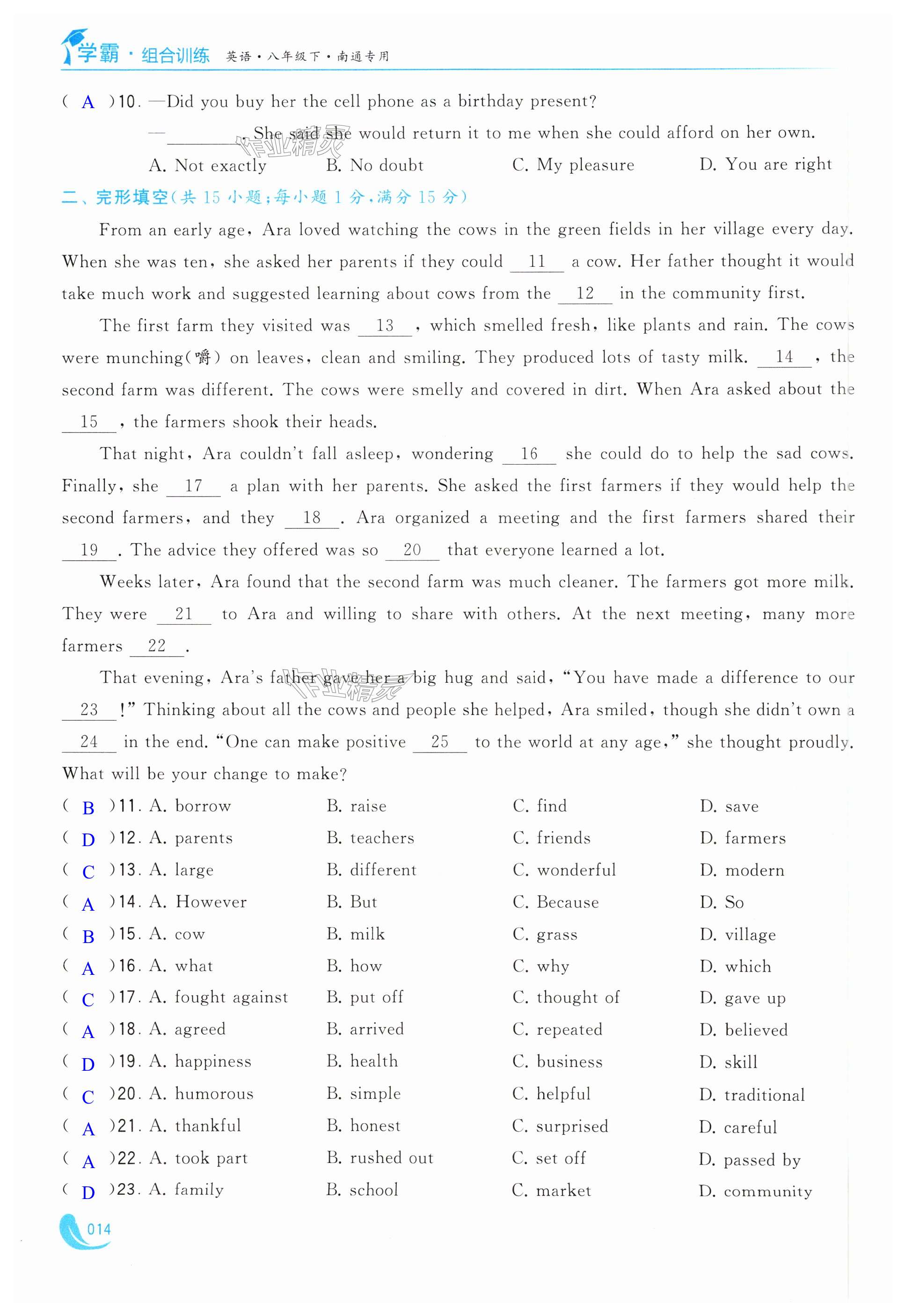 注:目前有些书本章节名称可能整理的还不是很完善,但都是按照顺序排列的,请同学们按照顺序仔细查找。练习册 2025年学霸组合训练八年级英语下册译林版南通专版 答案主要是用来给同学们做完题方便对答案用的,请勿直接抄袭。