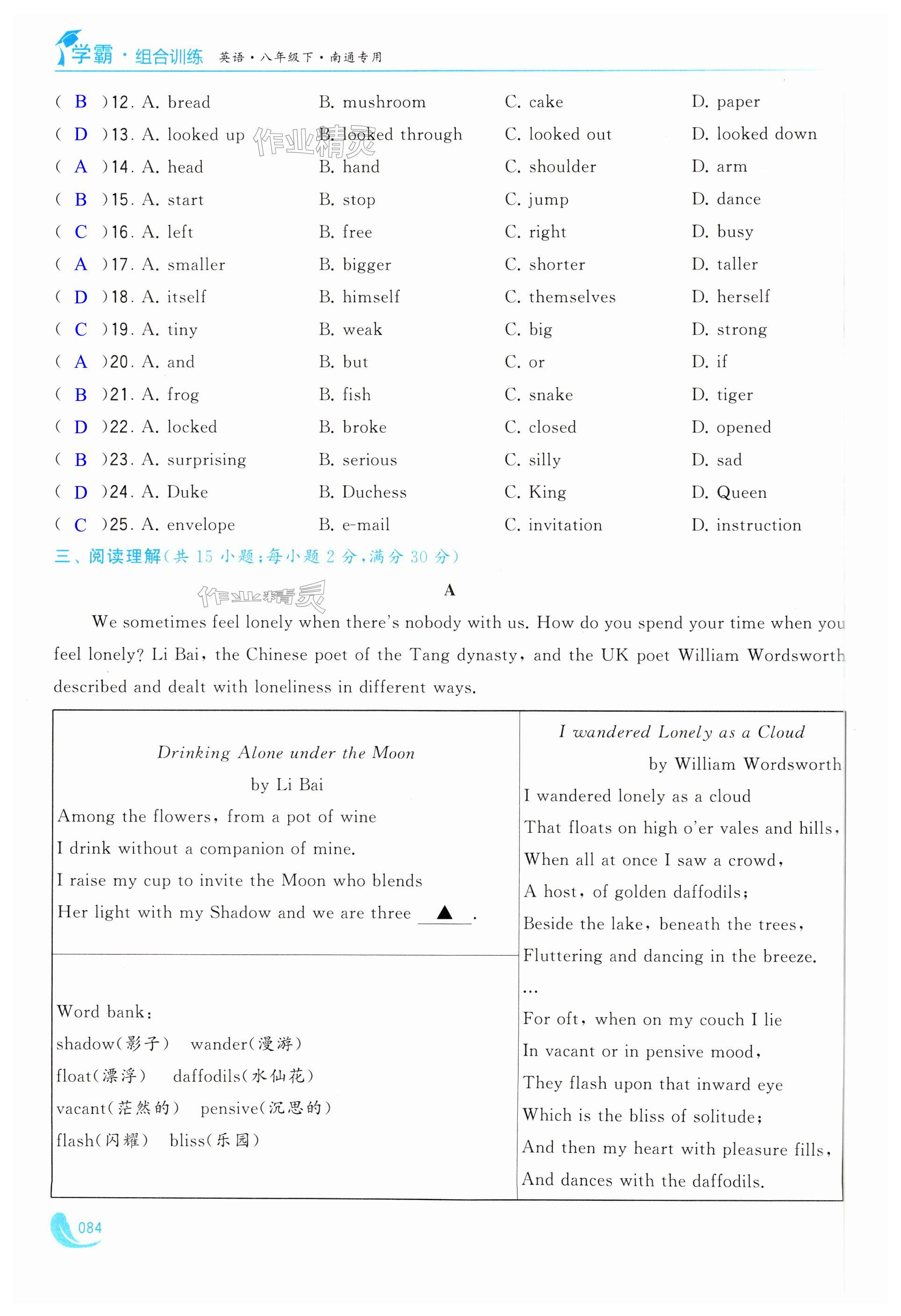注:目前有些书本章节名称可能整理的还不是很完善,但都是按照顺序排列的,请同学们按照顺序仔细查找。练习册 2025年学霸组合训练八年级英语下册译林版南通专版 答案主要是用来给同学们做完题方便对答案用的,请勿直接抄袭。