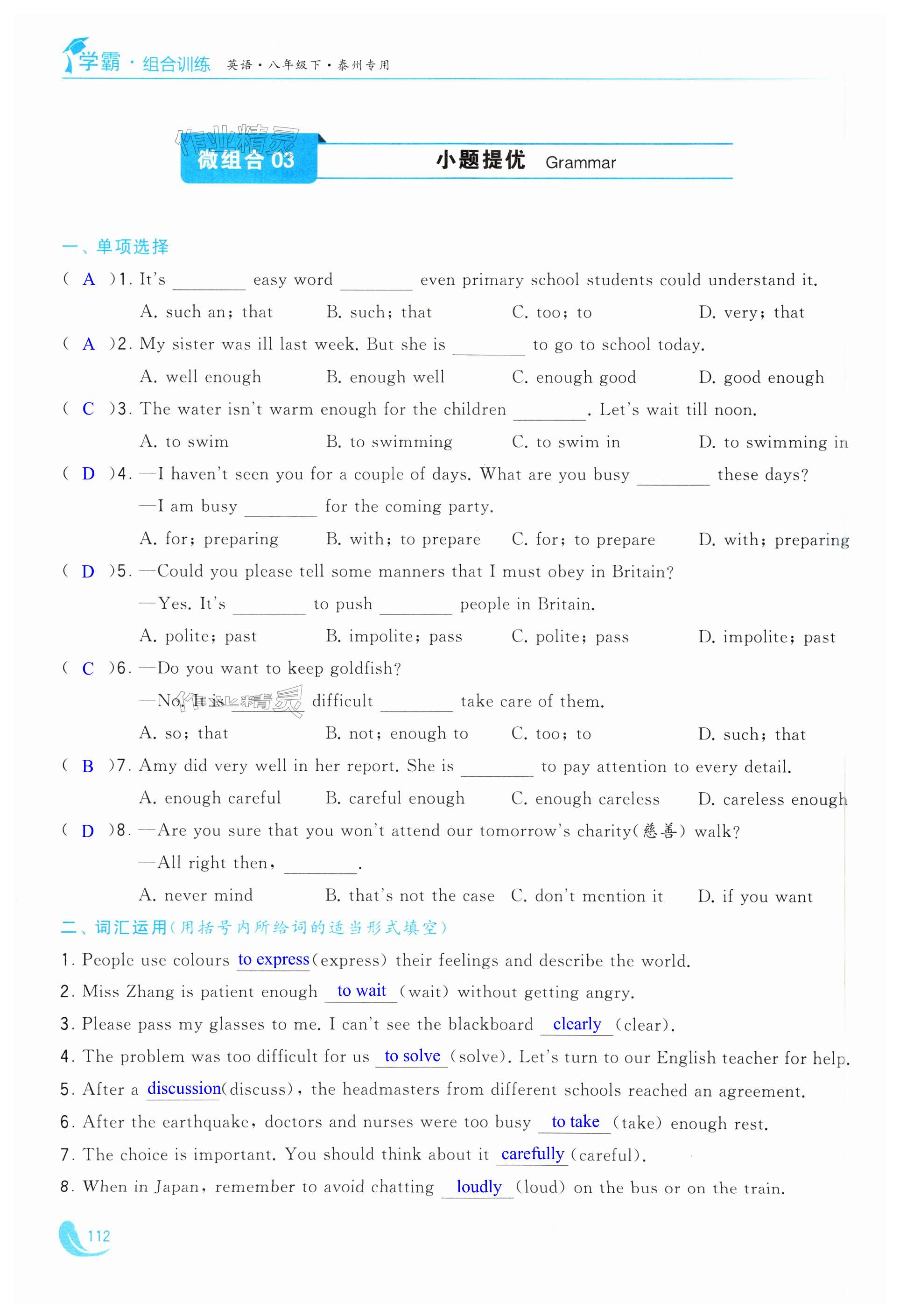 注:目前有些书本章节名称可能整理的还不是很完善,但都是按照顺序排列的,请同学们按照顺序仔细查找。练习册 2025年学霸组合训练八年级英语下册译林版泰州专版 答案主要是用来给同学们做完题方便对答案用的,请勿直接抄袭。