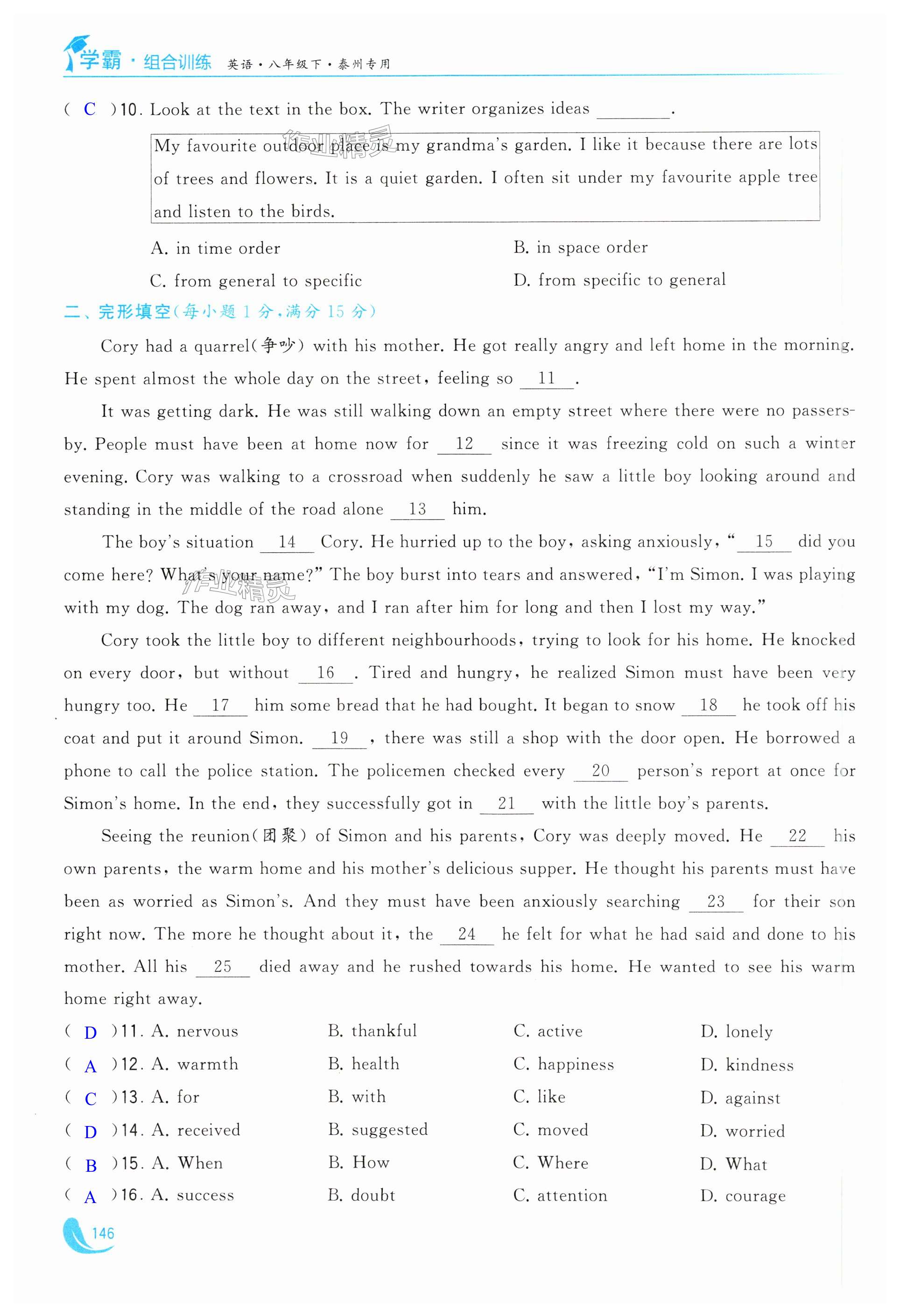 注:目前有些书本章节名称可能整理的还不是很完善,但都是按照顺序排列的,请同学们按照顺序仔细查找。练习册 2025年学霸组合训练八年级英语下册译林版泰州专版 答案主要是用来给同学们做完题方便对答案用的,请勿直接抄袭。