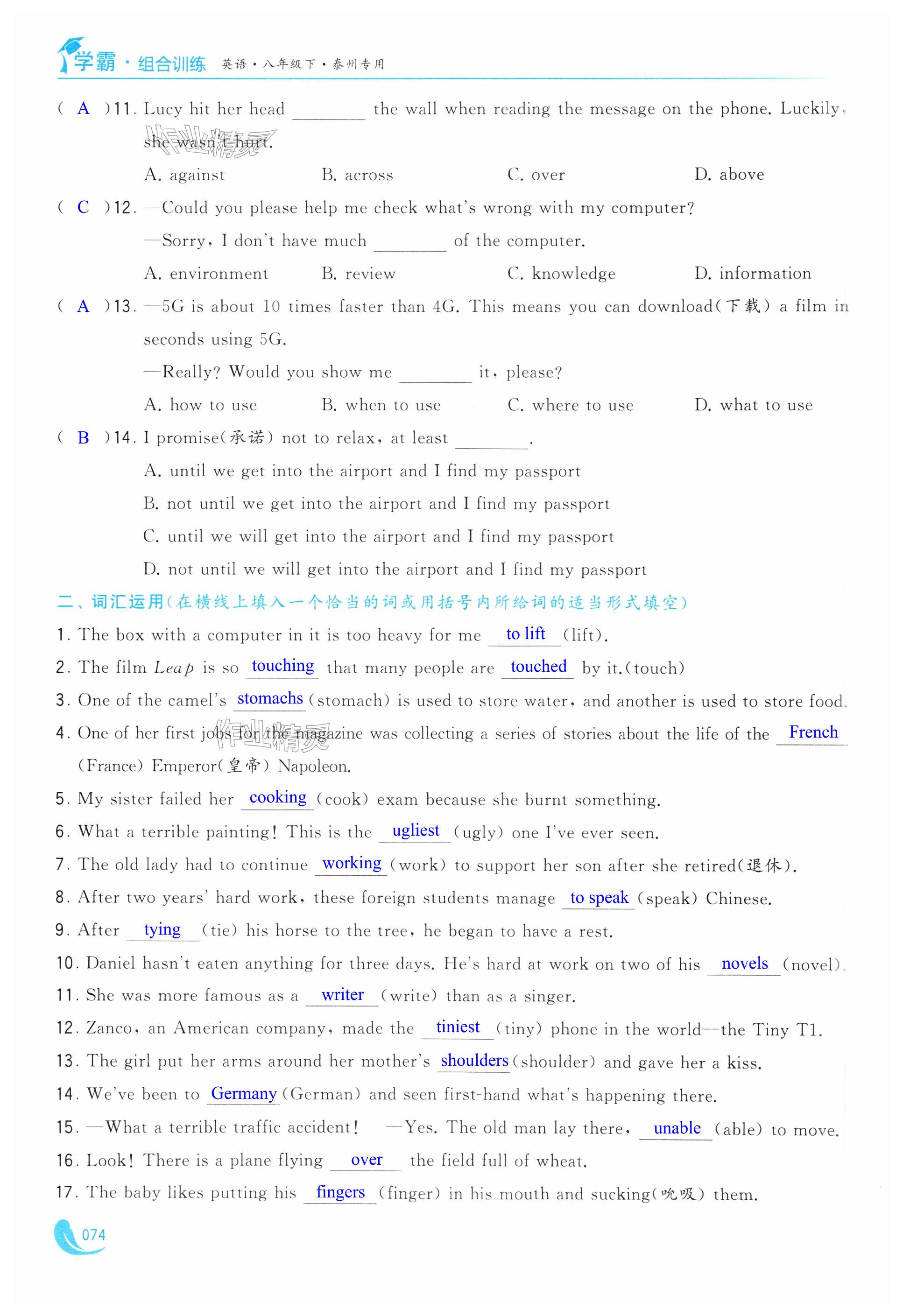 注:目前有些书本章节名称可能整理的还不是很完善,但都是按照顺序排列的,请同学们按照顺序仔细查找。练习册 2025年学霸组合训练八年级英语下册译林版泰州专版 答案主要是用来给同学们做完题方便对答案用的,请勿直接抄袭。