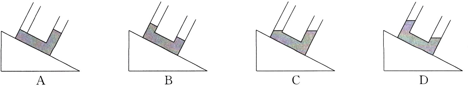 6. 固定在斜面上的U形容器里装有适量水,水静止,水面位置正确的是( )
