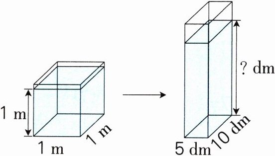 3. 1³ = 1(m³) 1 m³ = 1000 dm³ 1000÷(10×5) = 20(dm) 答:水面的高度是20 dm。 解析:先求出水的体积是1³ = 1(m³),然后根据“h = V÷S”求出倒入另一个长方体水族箱后水面的高度。要注意统一单位。