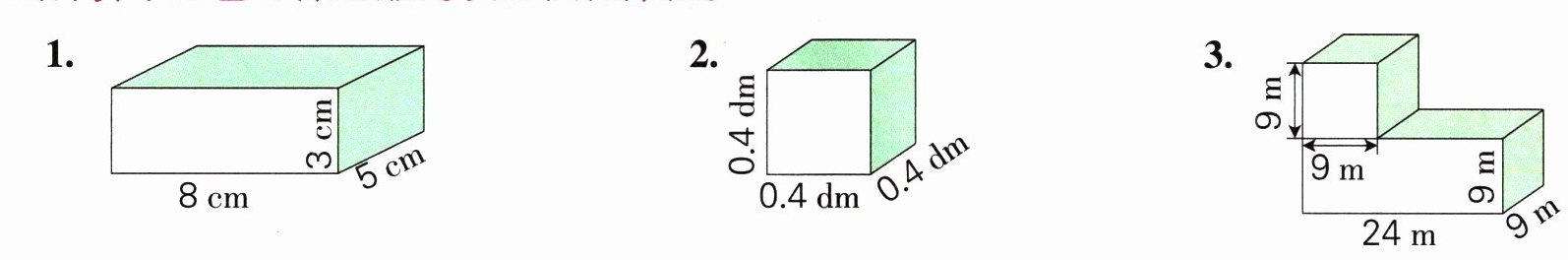 表面积:(8×5 + 8×3 + 5×3)×2 = 158(cm²) 体积:8×5×3 = 120(cm³) @@ 表面积:0.4×0.4×6 = 0.96(dm²) 体积:0.4×0.4×0.4 = 0.064(dm³) @@表面积:24×9×4 + 9×9×2 + 9×9×4 = 1350(m²) 体积:24×9×9 + 9×9×9 = 2673(m³)