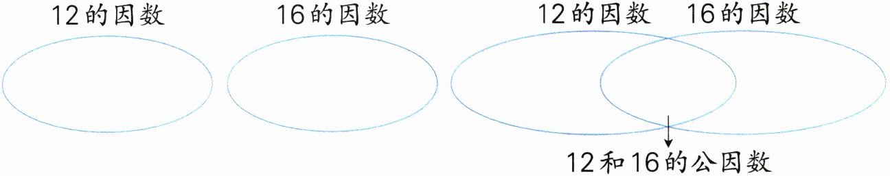 (此处为三个椭圆图,第三个椭圆图两部分分别为12的因数、16的因数,中间相交部分标注12和16的公因数)