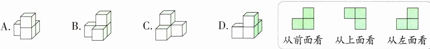 2.(佛山期末真题)用若干个同样的正方体模型摆一个几何体,从前面、上面和左面看到的图形如下图,这个几何体是( )。