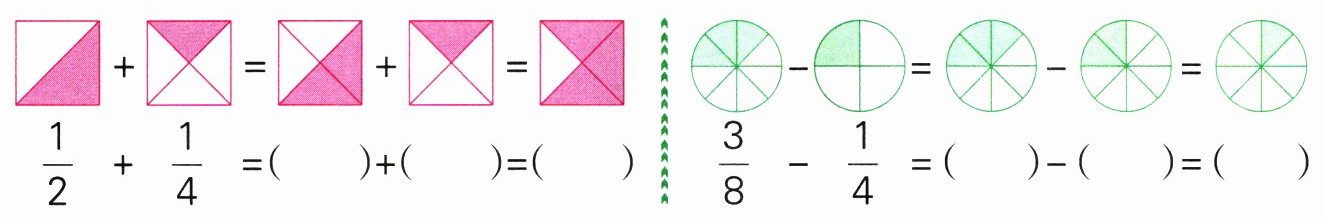 $\frac{1}{2}+\frac{1}{4}=(\frac{2}{4})+(\frac{1}{4})=(\frac{3}{4})$ $\frac{3}{8}-\frac{1}{4}=(\frac{3}{8})-(\frac{2}{8})=(\frac{1}{8})$
