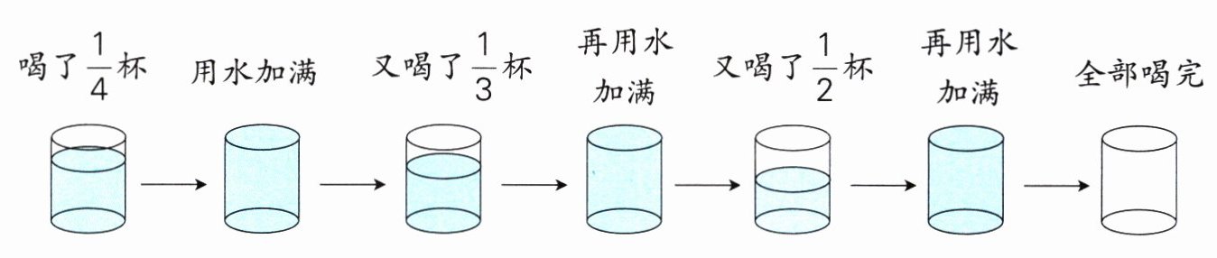 3.(中山期末真题)一杯纯果汁,小刚喝了$\frac{1}{2}$杯后,觉得太甜,就加满水,又喝了$\frac{1}{3}$杯。两次一共喝了多少杯纯果汁?(先画示意图,再解答)