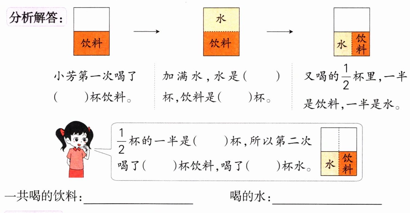 1. 一杯饮料,小芳喝了半杯后,觉得有些酸,就兑满了水,又喝了半杯,就去画画了。她一共喝了多少杯饮料?多少杯水?