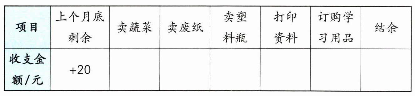 3. [新情境·五育文化]4月学校开展“童心协力,劳有所获”实践活动。六(1)班同学卖掉责任田中的蔬菜收入500元,卖废纸收入30元,卖塑料瓶收入46元,打印资料花了75元,订购学习用品花了180元。请你根据这些信息填写下表。