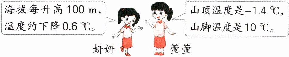 答案: 1900@@解析:因为海拔每升高100 m,温度约下降0.6 ℃,所以先求出山顶和山脚的温差是多少,再看这里面有几个0.6 ℃,黄山的高度就有几个100 m。1.4 + 10 = 11.4(℃),11.4÷0.6×100 = 1900(m)。