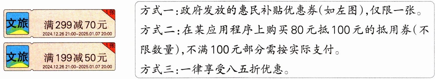 5. 张老师带着10名学生到八达岭长城旅游景区游玩,成人票54元/人,学生票半价。正值元旦期间,景区还推出了如下三种优惠方式(只能享受一种)。选择方式几最划算?