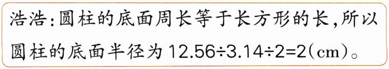5. [新趋势·说理分析]学习了圆柱的展开图后,老师给同学们留了一个问题:一个圆柱的侧面展开图是一个长12.56 cm、宽6.28 cm的长方形,这个圆柱的底面半径为多少厘米?你同意浩浩的说法吗?请说明理由。