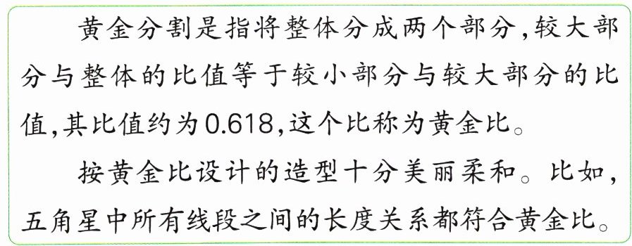 (2)一个人的肚脐以上的高度是61.8 cm,肚脐以下的高度是95 cm,( )(填“符合”或“不符合”)黄金比。若穿一双跟高为5 cm的高跟鞋,则符合黄金比,据此写出一个比例:( )。(两边比的比值约等即可)