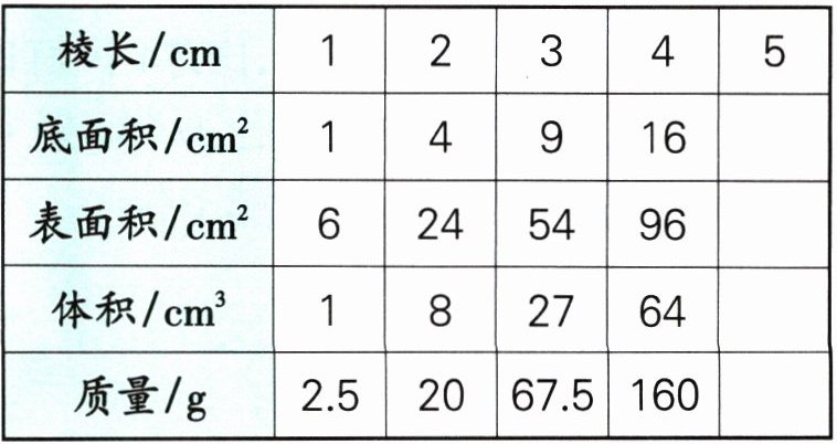 4. 石英石硬度较高、色彩多样。下表是关于正方体石英石的一些数据,哪两种量成正比例关系?说明理由并将下表补充完整。