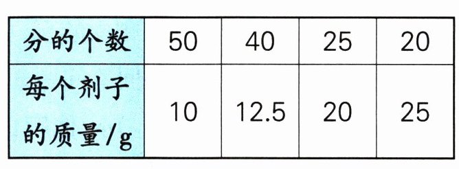3. [新情境·传统文化]清明前后吃艾粄(bǎn),一年四季不生病。妈妈用艾草和糯米粉等做成一个面团,把这个面团分成若干个相同的剂子,分的个数和每个剂子的质量如下表所示。