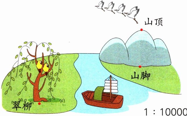 (3)(答案不唯一)白鹭中最下方的那只与山脚的实际距离是多少米? 量得图上距离是1.6 cm。 1.6÷1/10000 = 16000(cm) 16000 cm = 160 m 答:白鹭中最下方的那只与山脚的实际距离是160 m。 解析:已知比例尺和图上距离,根据公式“实际距离 = 图上距离÷比例尺”求出实际距离,再根据“时间 = 路程÷速度”求出时间。提出问题不唯一,合理即可。