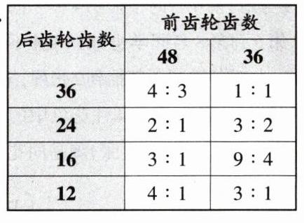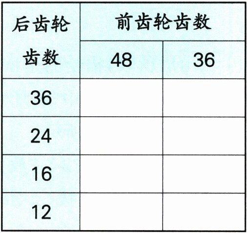 (2)前、后齿轮的齿数有8种不同的组合,组成了( )个比,其中有两个比相同,它是( )。这种变速自行车能变化出( )种不同的速度。蹬同样的圈数,要使自行车骑得最远,前、后齿轮的齿数比应是( )。