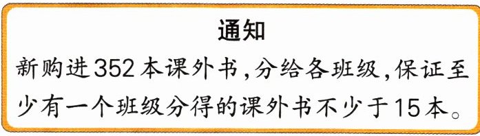 解析:“不少于15本”就是“至少有15本”,15 - 1 = 14(本),如果每班分得14本书,那么352本课外书可以分给25个班级,还剩下2本,此时至少有一个班级分得14 + 1 = 15(本)书,满足题意,故最多可以分给25个班级。