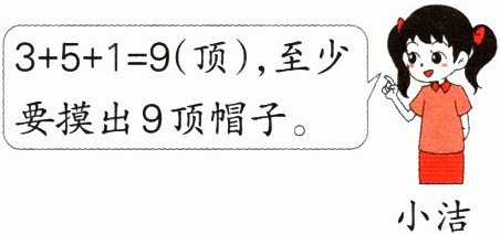 4. [教材改编]在一个不透明的盒子里有同样大小的红帽子3顶,黄帽子5顶,蓝帽子7顶。随意摸出一些帽子,要想摸出的帽子一定有三种颜色,至少要摸出几顶帽子?你同意小洁的解法吗?若不同意,则请你写出自己的解法。
