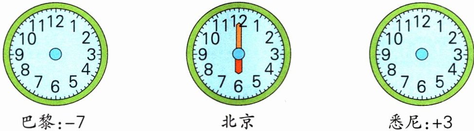 三、[教材改编]把北京时间记为0时,比北京时间早记作“+”,比北京时间晚记作“-”。请根据下面的提示,画出巴黎和悉尼这两个城市的时间。