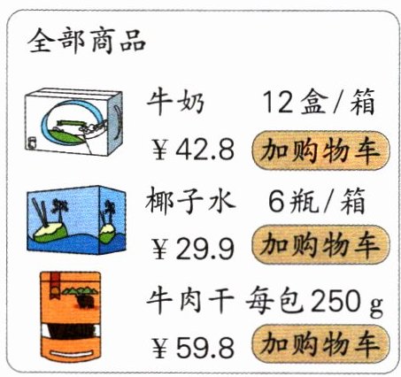 3. [新情境·社会热点]电商直播,助力乡村振兴!某直播间部分商品情况如图所示。妈妈有300元,打算从直播间购买2箱牛奶和3包牛肉干,还想买椰子水。请你估算一下,妈妈可以购买几箱椰子水?