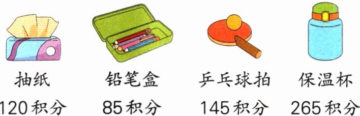 ①兑换2包抽纸和1个铅笔盒共需多少积分?