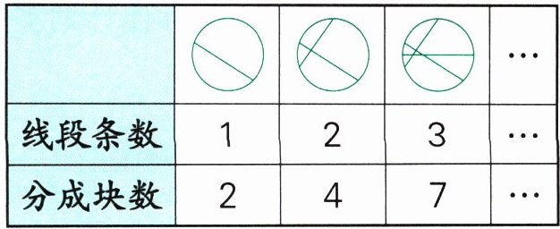 5. 莉莉在研究“圆形纸片最多能分成多少块”问题,并列出右表。若最多分成11块,则需画( )条线段;若画n条线段,则最多分成( )块。