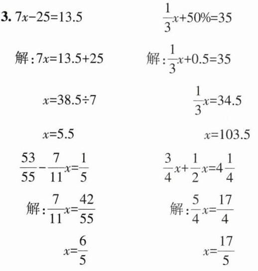 7x - 25 = 13.5 $\frac{1}{3}x + 50\% = 35$ $\frac{53}{55} - \frac{7}{11}x = \frac{1}{5}$ $\frac{3}{4}x + \frac{1}{2}x = 4\frac{1}{4}$