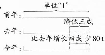 4. 一条铁路去年的货运量比前年降低了三成,今年的货运量预计比去年增长四成,仍比前年少80 t,这条铁路前年的货运量是多少吨?(画线段图帮助解答)