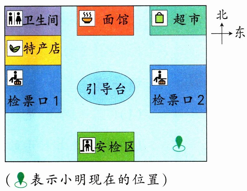 1. 售票厅在进站口的北面,从售票厅去进站口,要向( )面走。