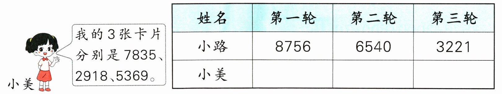 8. [新情境·数学文化]“田忌赛马”比大小,小美和小路分别有3张数字卡片,每轮拿出一张,数大的一方获胜,获胜次数多的一方最终胜利。小美怎样拿卡片才能获得最终胜利?填一填。