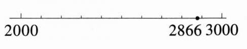 2. 中国人把龙视为祥瑞,承载着勇敢、吉祥等美好寓意。张叔叔用 2866 片贝壳制作了一件祥龙摆件,在数线上标出 2866 的大致位置。