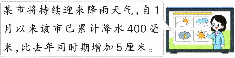 小明家的电视长 150( ),距离地面高 8( ),电视上正在播放天气预报,小明坐在距离电视 3( )5( )的沙发上收看。