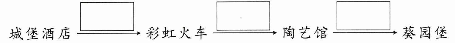 (2)壮壮从城堡酒店出发,一路参观、游玩到葵园堡,他的路线如下。请在方框里填上方位词。