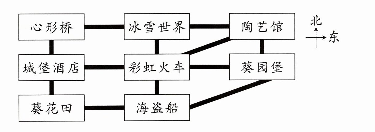 (1)心形桥在彩虹火车的( )方向,彩虹火车的南面是( )。