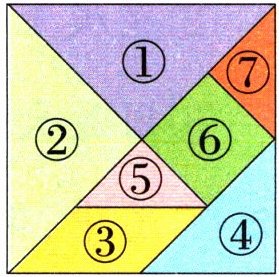 1. 如图,七巧板中的图形( )是正方形,图形( )是平行四边形。三角形有( )个,每个三角形中都有( )个直角和( )个锐角。