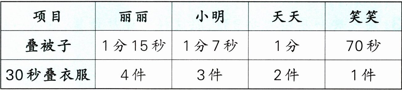 叠被子项目中,( )获得第一名。30秒叠衣服项目中,( )获得第一名。