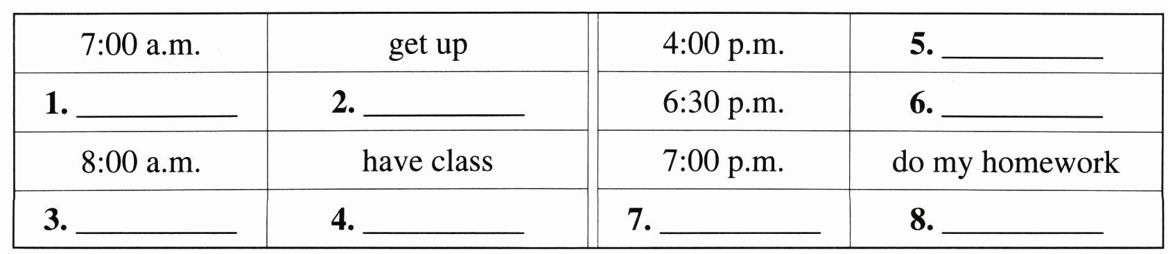 根据短文内容,选择合适的时间,把其大写字母编号写在表格相应位置;并写词组补全Jiamin的日常作息表。