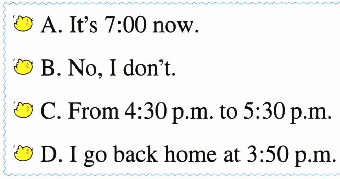 ( ) 5. It’s ______. It’s time to sleep. E. 9:00 p.m.