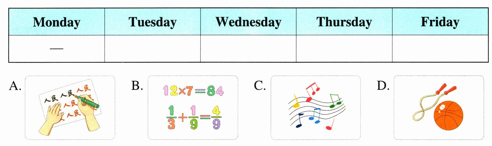 (二)再听对话两次,找出各科目的上课日子,将字母编号写在相应的表格里。