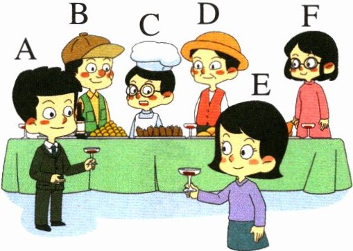 一、几位朋友参加了你的生日派对,你向母亲介绍他们。听句子三次,根据所听内容在图中找出对应的人物,把人物的字母编号写在相应的括号内。