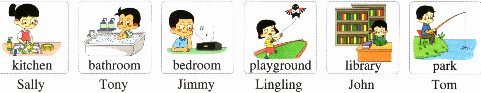 taking a bath in the bathroom. Jimmy is listening to music in the bedroom. Lingling is flying a kite in the playground. John is doing some reading in the library. Tom is fishing in the park.