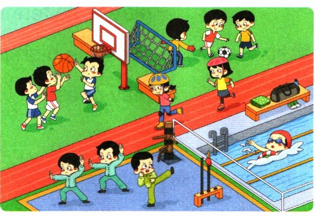 孩子们正在操场进行体育锻炼,增强体魄。根据所给图片,选择单词或词组补全文段,复述课文内容。