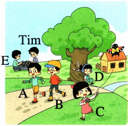 Zhang Hua and Wang Li are skating. They are tall. Zhang Hua is the boy with a cap. Li Dong is playing chess with Tim. Lily and Xiaofang are wearing dresses. Lily is flying a kite. Xiaofang is listening to music under the tree.