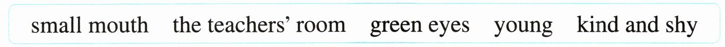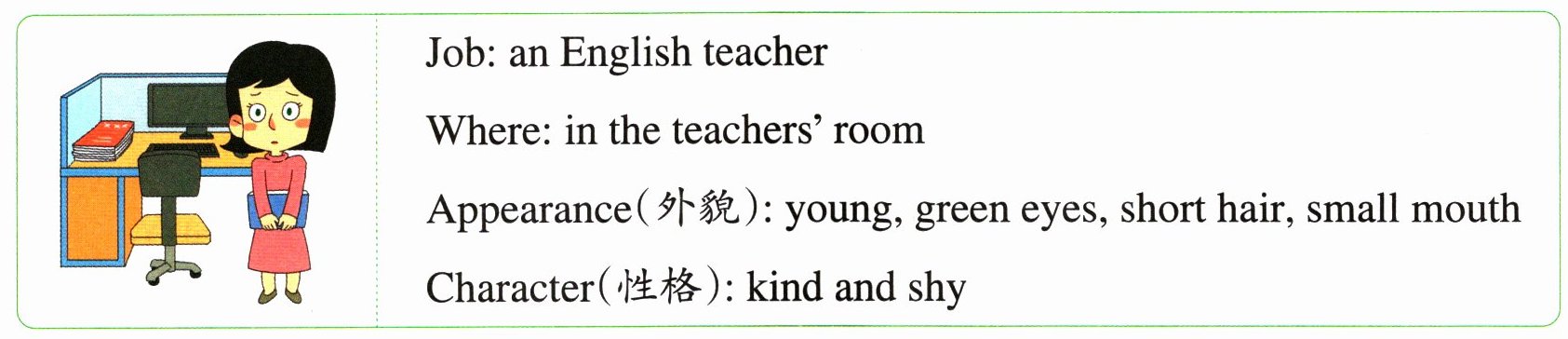| Miss Li | a Chinese teacher | in the classroom | long hair, tall | quiet(安静的) |