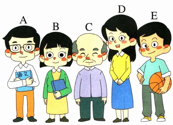 四、看图听描述三次,将人名与图中相应人物匹配,把图中大写字母编号写在括号内。
