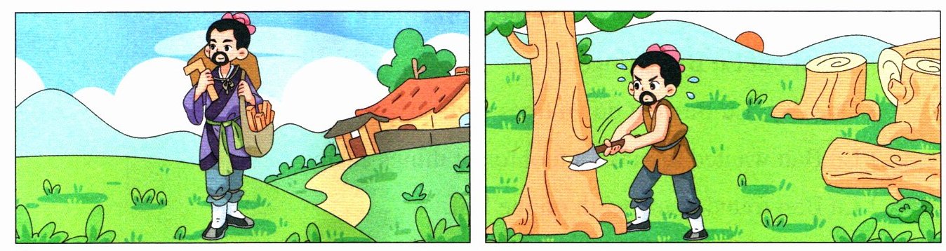 ② One day, he worked in a mountain. He used an axe to cut down trees, but he could only cut down a few trees a day. He wanted to make a tool.